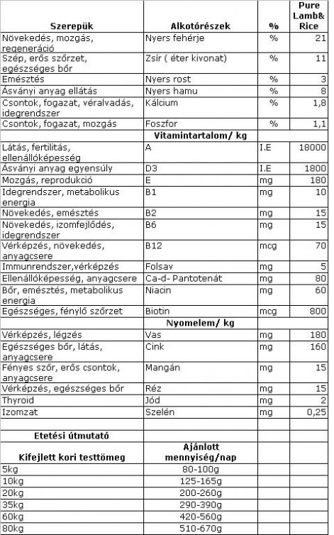 Az új PURE LAMB & RICE valódi minőséget képvisel a BASIC LINE vonalon belül. Gondosan kiválasztott alapanyagokból készül. Fő fehérjeforrásként 100%-ban bárányhúst, szénhidrát-forrásként könnyen emészthető rizst tartalmaz. Fehérje-allergiás kutyák is jól hasznosítják. A benne található élesztő támogatja az emésztőrendszert és segíti a tápanyagok hatékonyabb felszívódását. A PURE LAMB & RICE kímélő száraz eledel, amely átlagos és nagy mozgásigényű kutyáknak egyaránt adható.